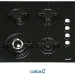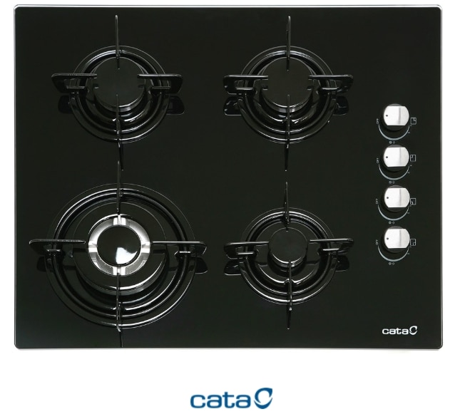 Encimera de gas cristal negro de 59cm de 4 quemadores para Gas Natural (entrada gas: parte trasera derecha) e inyectores de Gas Butano incluidos en la caja. Parrillas/Quemadores esmaltados.