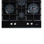 Encimera de gas cristal negro de 64cm (encastre de 60cm) de 4 quemadores para Gas Natural (entrada gas: parte trasera derecha) e inyectores de Gas Butano incluidos en la caja. Parrillas/Quemadores de hierro fundido.