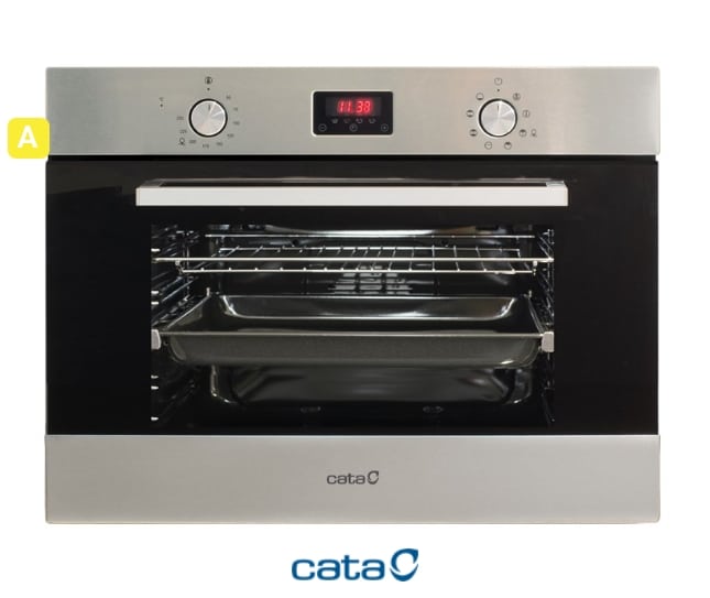 Horno multifunción de 45cm con acabado en inox, Display digital con 8 funciones y programación de tiempo y de temperatura y mandos PushPull escamoteables, 40litros de capacidad y 1 guía telescópica adaptable a cualquier nivel. 4 niveles para colocación de bandejas de fácil desplazamiento. Puerta panorámica full glass. Puerta fría 3 cristales con ventilación tangencial. Accesorios: Bandeja profunda y parrilla. Sistema de limpieza AquaSmart. 220/240V 50/60Hz. Clase de eficiencia energética: A