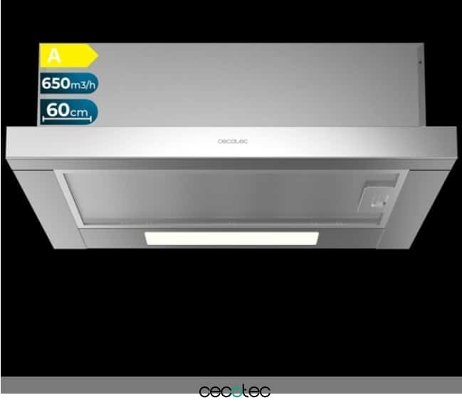 Campana extractora telescópica Flux TLM 603500 Inox A de 60cm de ancho, acabado inox, potencia succión 650m3/h, Motor 165W, Clase A, control mecánico, 3 niveles de potencia y filtro de carbono.