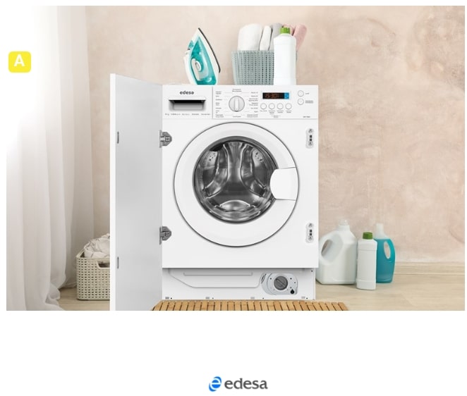 Lavadora de carga frontal de integración Capacidad de 1 a 9 kilos Velocidad máxima de centrifugado 1.400 r.p.m. Clasificación energética A Motor Inverter de alta eficiencia energética Bloqueo seguridad niños y bloqueo de puerta durante el Funcionamiento 16 programas de lavado, 850 x 590 x 440 mm