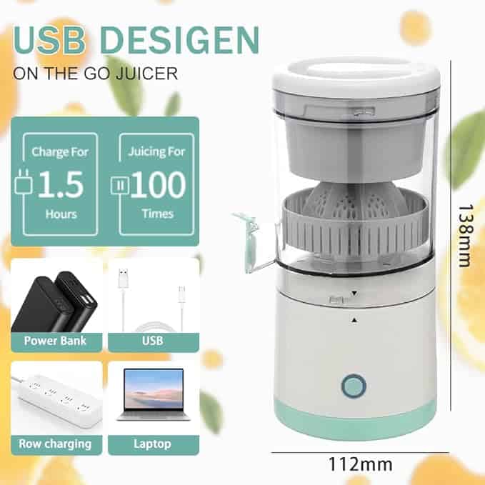- 🍋【Carga USB, fácil de transportar】 El exprimidor eléctrico de jugo de naranja adopta la carga USB, es más conveniente cargar el exprimidor cuando está al aire libre y de viaje, y no tiene que preocuparse por quedarse sin energía. El exprimidor eléctrico es inalámbrico y portátil, se puede usar en cualquier momento y en cualquier lugar, no solo en casa, sino también al aire libre, como picnics, playas, fiestas, barbacoas, etc.