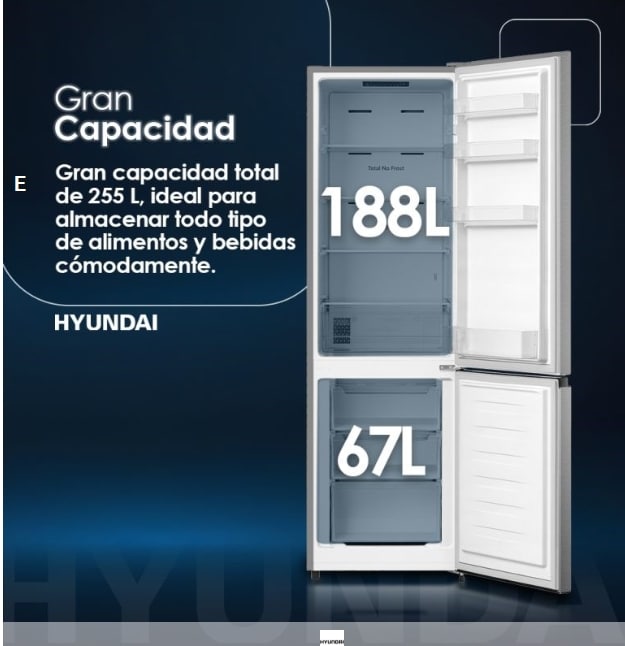 Frigorífico Combi Hyundai, No Frost. Clase E. Dimensiones: 179,7cm 55cm 56,3cm. Color Inox, Control Electrónico.