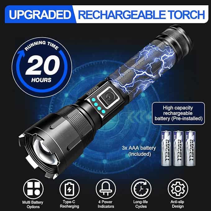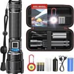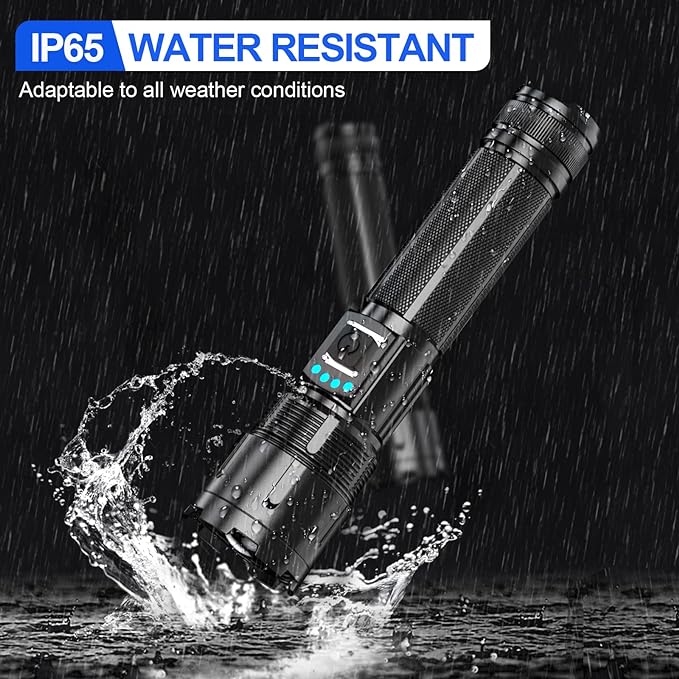 • EXTREMADAMENTE BRILLANTE 30.000 LUMENS: Las perlas LED de la linterna se han actualizado para proporcionar un haz más brillante que nunca, hasta 6 veces más brillante que otras linternas, lo que facilita la iluminación de toda una habitación o garaje. Con una vida útil más larga y un tiempo de recarga más corto, esta linterna satisfará sus necesidades diarias de iluminación. Si no se utiliza uno de los modos durante más de 10 segundos, la linterna simplemente se apaga.