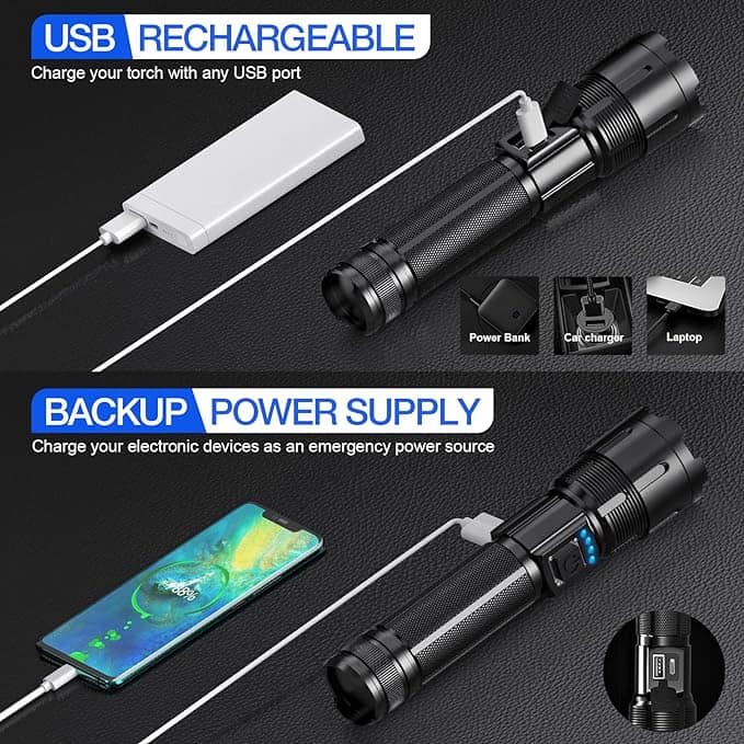 Linterna Táctica –  LED Recargable con Powerbank – IP65 Impermeable – USB Linterna Camping para Camping, Senderismo, Exteriores, Emergencias [Clase de eficiencia energética A+++]
