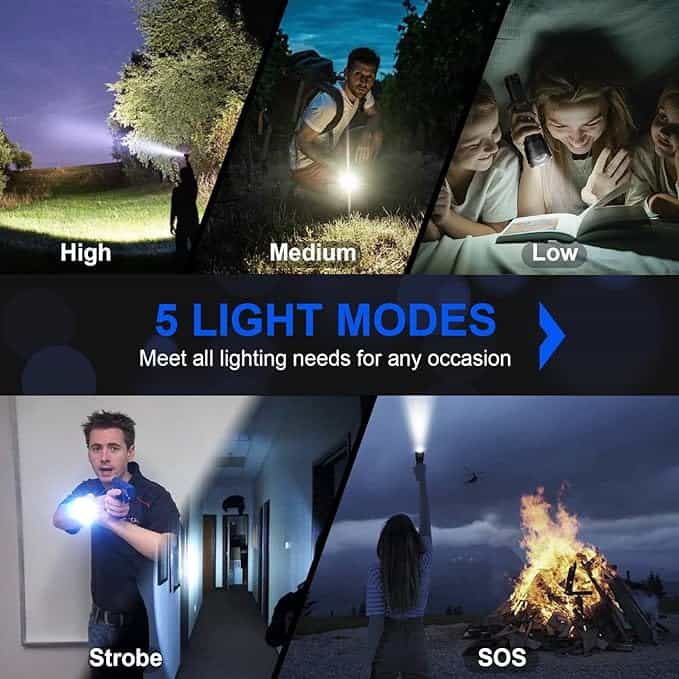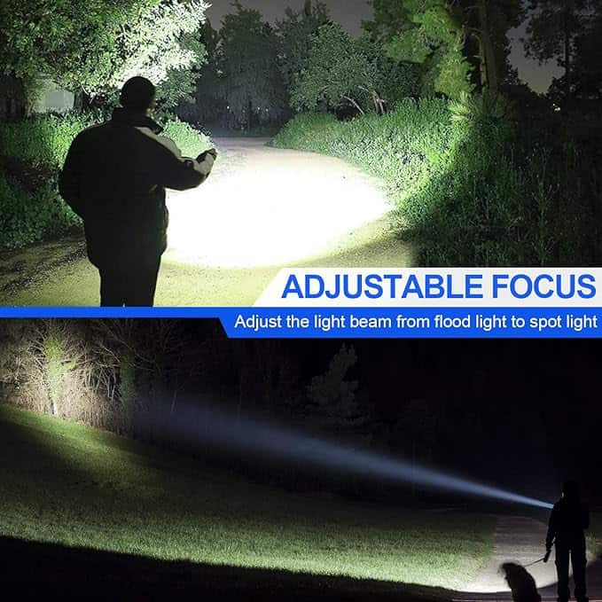 • 5 MODOS Y ZOOMABLE: La linterna táctica tiene 5 modos de iluminación (alta / media / baja / estroboscópica / SOS) para todas sus necesidades de iluminación.la linterna LED recargable USB cuenta con un diseño de barra de zoom que le permite elegir entre una gran luz de inundación o una pequeña luz del punto con sólo estirar la cabeza. Con hasta 20 horas de autonomía en modo de ahorro de energía, podrás superar tu miedo a la oscuridad.