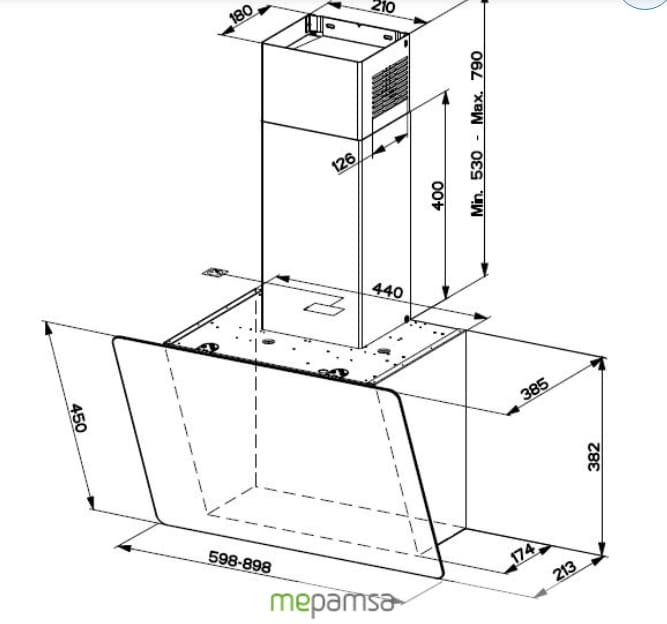 Campana Vertical, Clase C, Máx: aspiración 600 m3/h, Presión 500 (Pa), Nivel sonoro 63 db, 2 x 1 W LED, Aspiración perimetral, Chimenea / canal incluido del mismo color que la campana