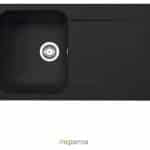 Fregadero encastre de una cubeta con escurridor reversible en resinas de color negro para mueble de 50 cm. 860 x 500 mm – Cubeta: 365 x 420 x 190 mm – Encastre: 840 x 480 mm Accesorios incluidos: – Válvula 3¿- – Rebosadero