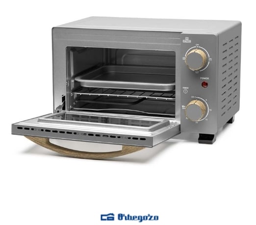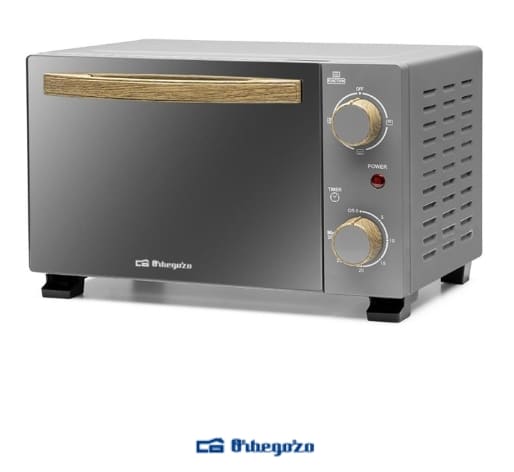 Horno eléctrico. Potencia: 800w. Capacidad: 10 litros. Temporizador hasta 30 min con señal acústica. Puerta abatible de doble cristal templado con efecto espejo. Selector de calor superior, inferior o simultáneo. Ideal para tostar, asar, gratinar y calentar. 2 barras calefactoras curvas para una distribución uniforme del calor. Indicador luminoso de funcionamiento. Accesorios: bandeja, bandeja recogemigas, rejilla y gancho para bandeja. Medidas: 37,5 x 23,5 x 31 cm. Conexión: 230v~50hz