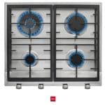 Placa de cocción a gas (butano/propano o natural). Mandos frontales metalizados incorporados con frente negro. Seguridad por termopar integrada en quemador individual. Autoencendido integrado en quemador y accionado por cada mando. Quemadores de alta eficiencia. 50x58x33